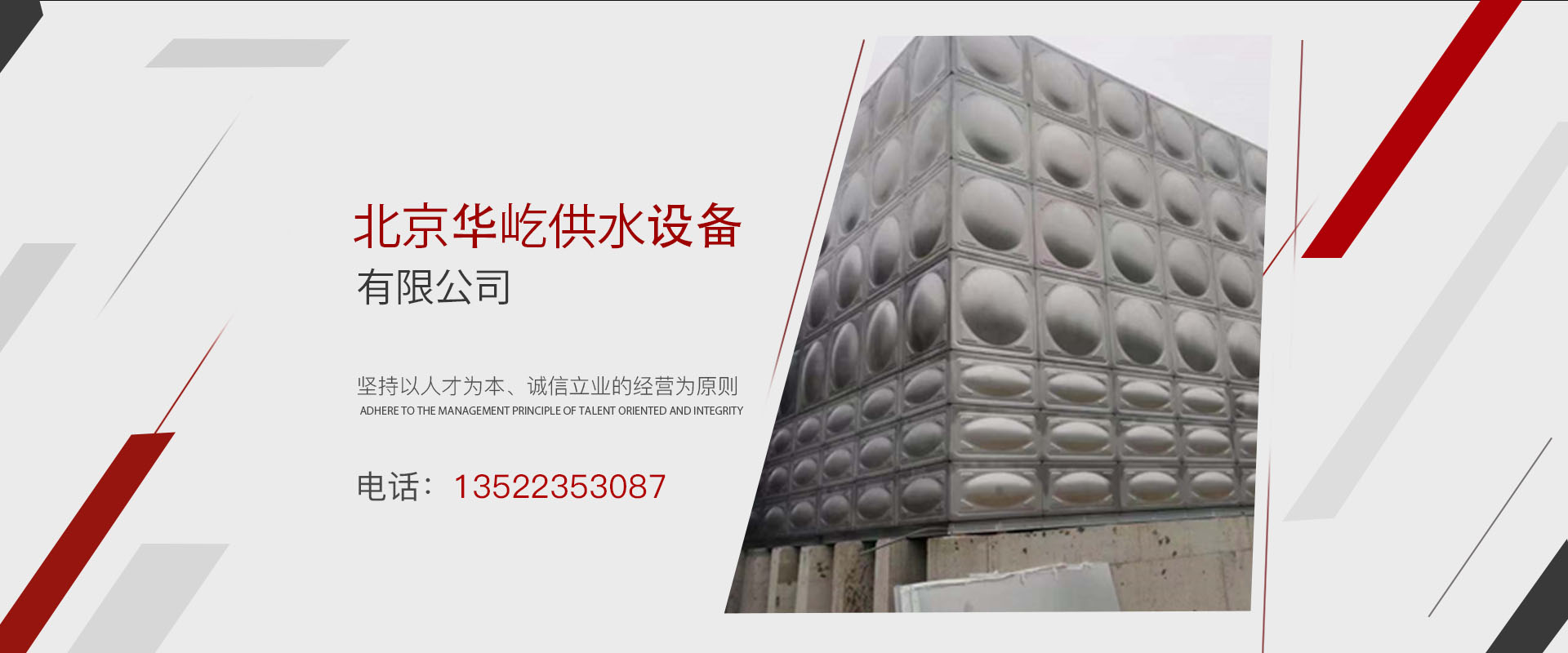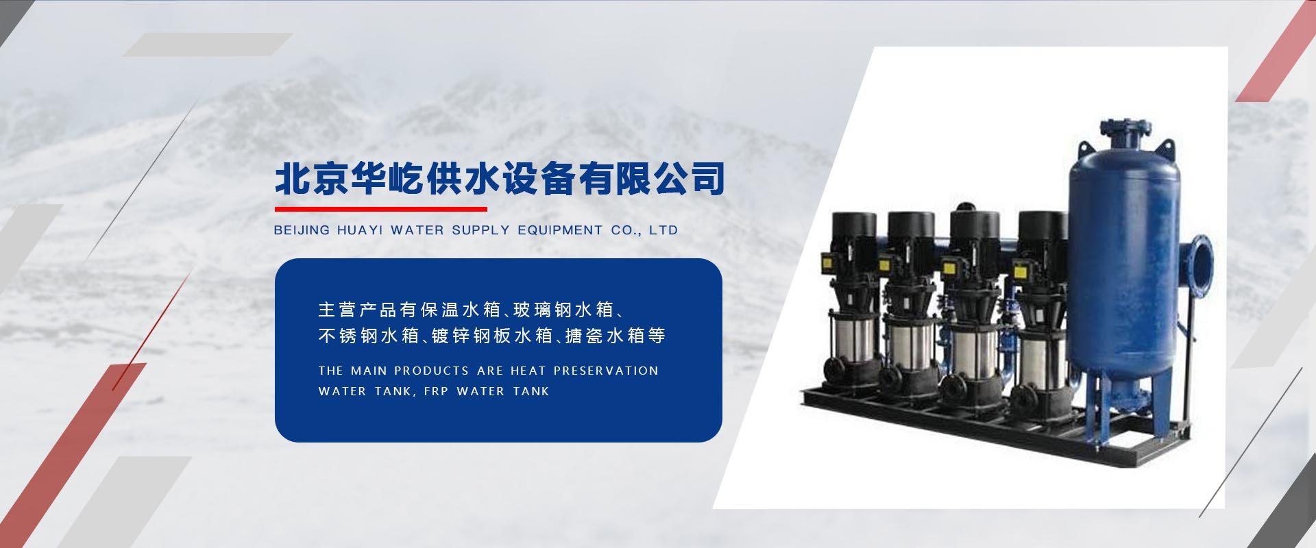主營產品有不銹鋼水箱、玻璃鋼水箱、搪瓷鋼板水箱、無負壓供水設備、恒壓供水設備、消防供水設備、水處理設備,供水設備改造和設備保養服務。